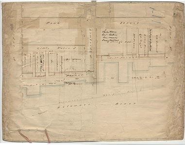 Plan, [Handwritten title on reverse: "Delaware Avenue From Pine to Cedar St., Filed July 29th 1839" According to Plan Book 1, in Streets Dept., City Plans Unit, this plan was made "to accompany report of [road] jury to Court of Quarter Sessions] , 1839 Original size: 16 x 21 in. (estimated)