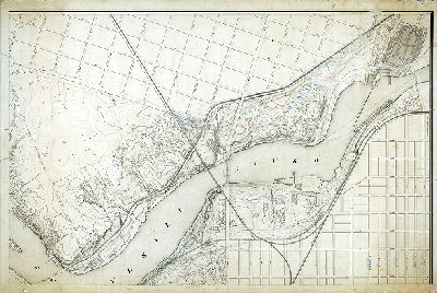 Plan (alternate image), [No title. Fairmount Park topography. Additions in pencil probably related to the route of the Philadelphia and Reading Railroad through Fairmount Park from the bridge over Fountain Green to the Columbia Bridge] Original size: 44 x 65 in. (estimated)