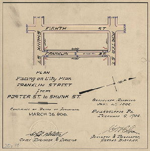 Plan, Plan for placing on City Plan Franklin Street from Porter St. to Shunk St. [Ordinance Jan. 15, 1906; survey returned Feb. 6, 1906; confirmed March 26, 1906] Original size: 9 x 9 in. (estimated)