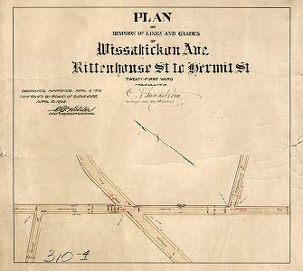 Plan, Plan of revision of lines and grades of Wissahickon Ave., Rittenhouse St. to Hermit St., Twenty-first Ward Philadelphia [Ordinance April 4, 1902; confirmed April 6, 1903] Original size: 17 x 19 in. (estimated)