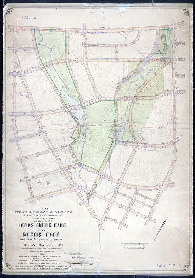 Plan, Plan to place on city plan as a public park certain tracts of land in the Thirty-fourth Ward as additions to Cobb's Creek Park and Morris Park and to make the necessary revision of lines and grades of streets. [Ordinances Dec. 2, 1911, March 14, 1912, May 9, 1912, and June 21, 1915; "revised 8-9-15"; confirmed Dec. 29, 1915] {This plan originally misfiled as 342-1; it falls in City Plan 343 and should be numbered 343] Original size: 44 x 62 in. (estimated)