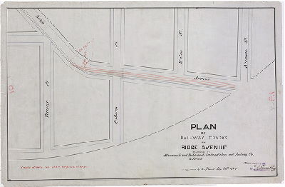 Plan, Plan of rail-way tracks on Ridge Avenue belonging to Manayunk and Roxborough Inclined Plane and Railway Co. [Plan originally approved July 20, 1874; survey with changes returned Sept. 3, 1888] Original size: 17 x 26 in. (estimated)
