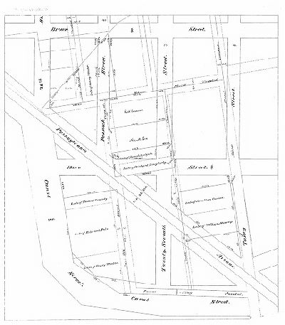 Plan, [No title. Property survey, vicinity of 27th and Parrish, for Brinton. In original, vacated streets - Manor St., Bush Hill St., Canal Alley and Acorn Alley - drawn in red ink], 1871 Original size: 23 x 26 in. (estimated)