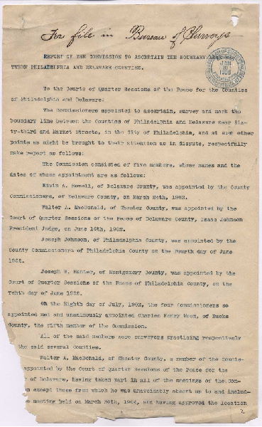 p. 2, ZZ. Report of Commission to ascertain boundary lines between Philadelphia and Delaware Counties. Filed Jan. 20, 1905 Original size: 4 x 7 in. (estimated)