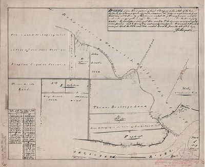 Plan, Draught of four lots or parcels of land belonging to the estate of the late William Bingham Esquire, deceased, situate in the Island and township of Tinicum, in the County of Delaware and State of Pennsylvania…June the 6th 1825, by Jno. Thomson [Tracing copy likely made by William H. Jones in 1884], 1825 Original size: 20 x 25 in. (estimated)