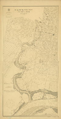 Soundings, building footprints, bridges, tributary streams, marshland, river bank, wharves